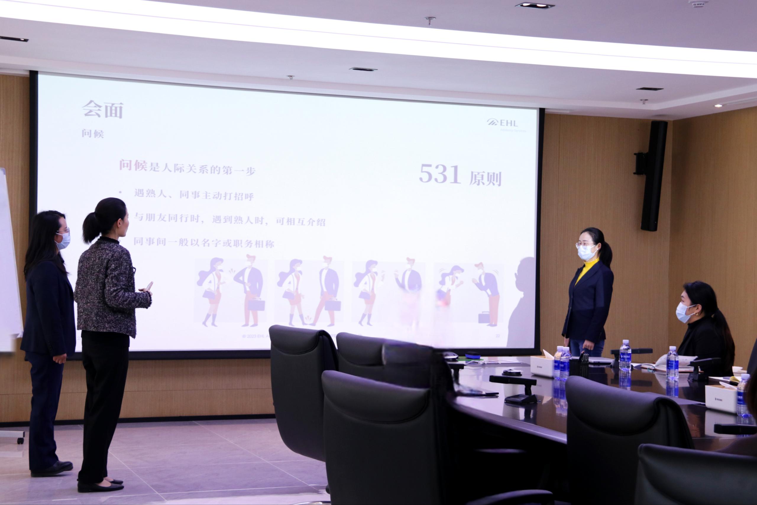 此次培訓邀請了洛桑酒店管理學院集團咨詢公司顧問呂堃講師、助理顧問謝一晗講師針對商務禮儀進行授課。在培訓中,兩位培訓講師采取理論教學和現(xiàn)場互動實踐相結合的方式。一方面,通過援引事例生動闡釋商務禮儀的概念、作用、行為標準等理論知識;另一方面,通過場景模擬實踐、特定情境互動表演等環(huán)節(jié)詳細示范和訓練禮儀規(guī)范。參訓人員即學即練,在現(xiàn)場實踐互動中加深了對商務禮儀的理解和把握。