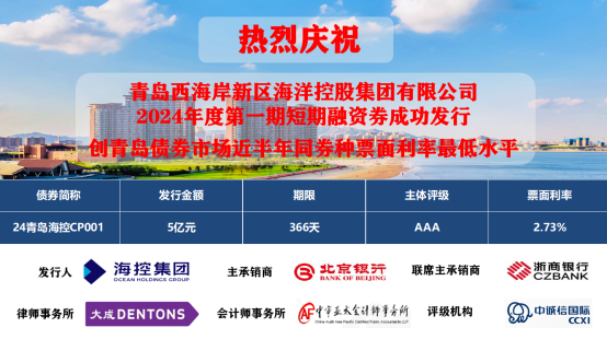 1月19日,海控集團成功發(fā)行2024年度第一期短期融資券(24青島海控CP001),募集資金5億元,期限1年,發(fā)行利率為2.73%,認購倍數(shù)5.72倍,創(chuàng)青島債券市場近半年同券種票面利率最低水平。