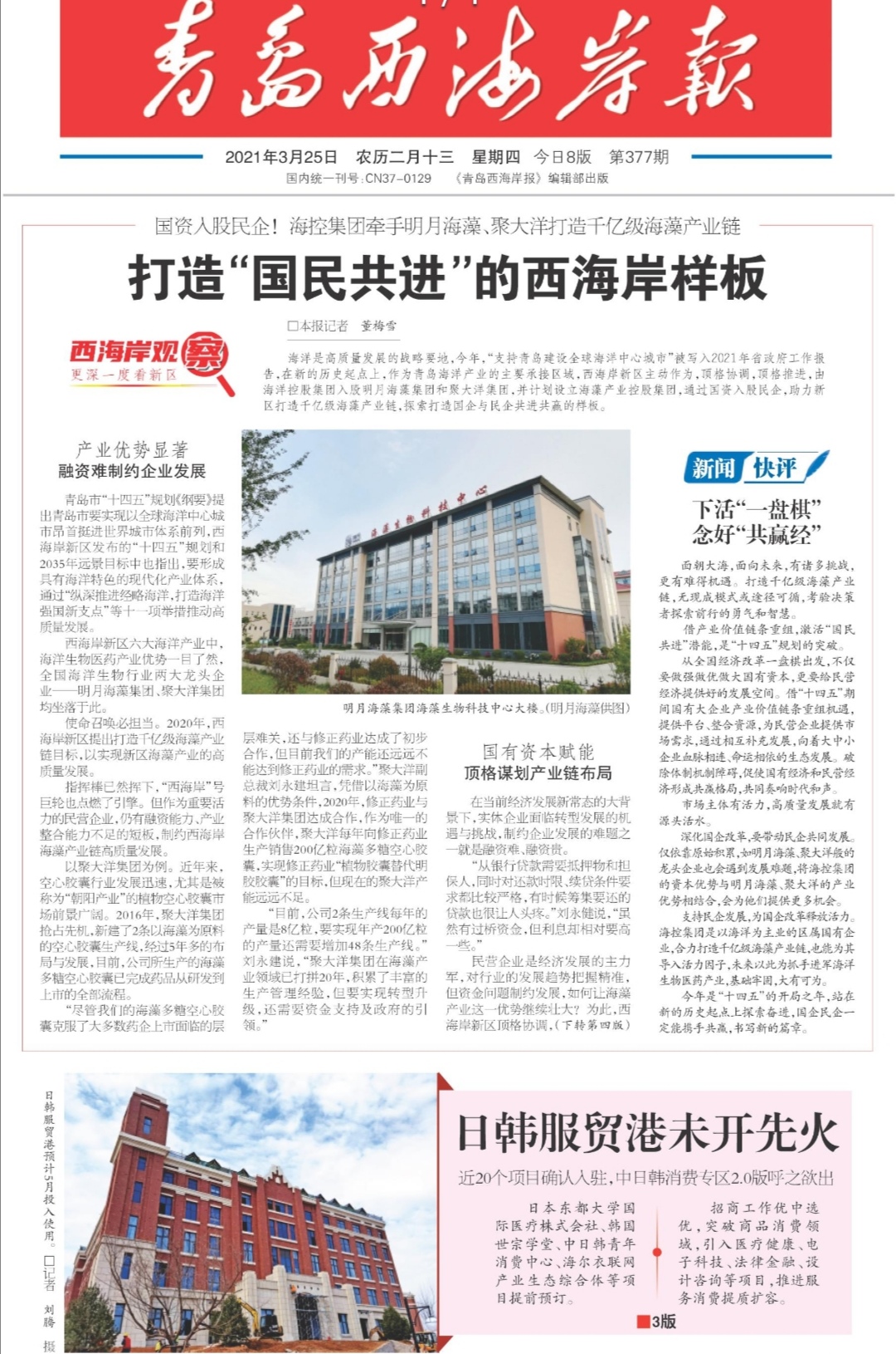 海洋是高質(zhì)量發(fā)展的戰(zhàn)略要地,今年,“支持青島建設(shè)全球海洋中心城市”被寫入2021年省政府工作報告,在新的歷史起點(diǎn)上,作為青島海洋產(chǎn)業(yè)的主要承接區(qū)域,西海岸新區(qū)主動作為,頂格協(xié)調(diào),頂格推進(jìn),由海洋控股集團(tuán)入股明月海藻集團(tuán)和聚大洋集團(tuán),并計劃設(shè)立海藻產(chǎn)業(yè)控股集團(tuán),通過國資入股民企,助力新區(qū)打造千億級海藻產(chǎn)業(yè)鏈,探索打造國企與民企共進(jìn)共贏的樣板。