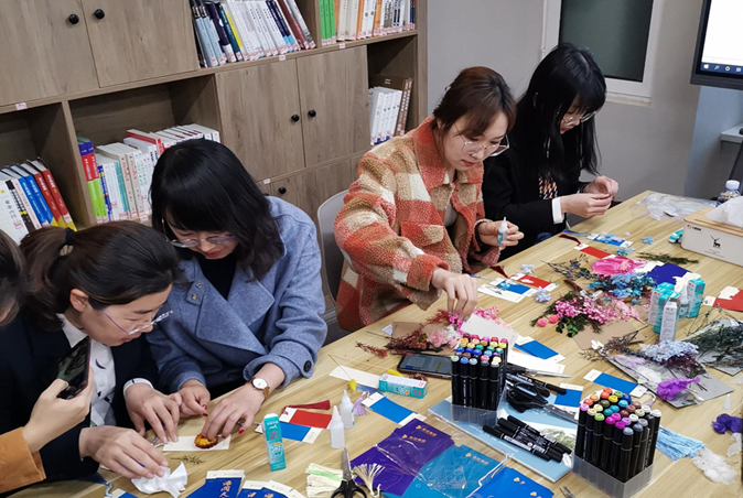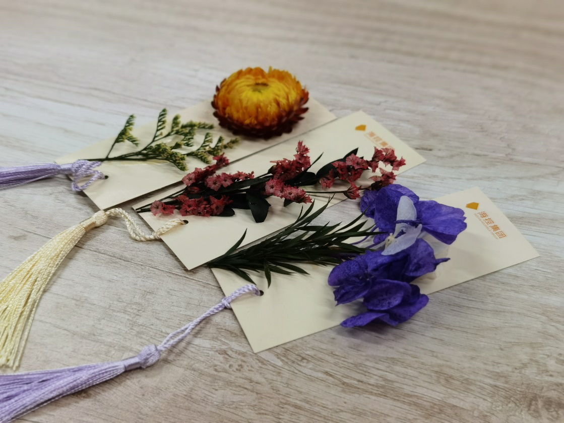 現場擺放有集團定制logo書簽、空白書簽、干花和各色馬克筆。在學習小組和文藝小組的帶領下,大家用手中的畫筆和工具,在書簽上揮灑著創意與靈感。