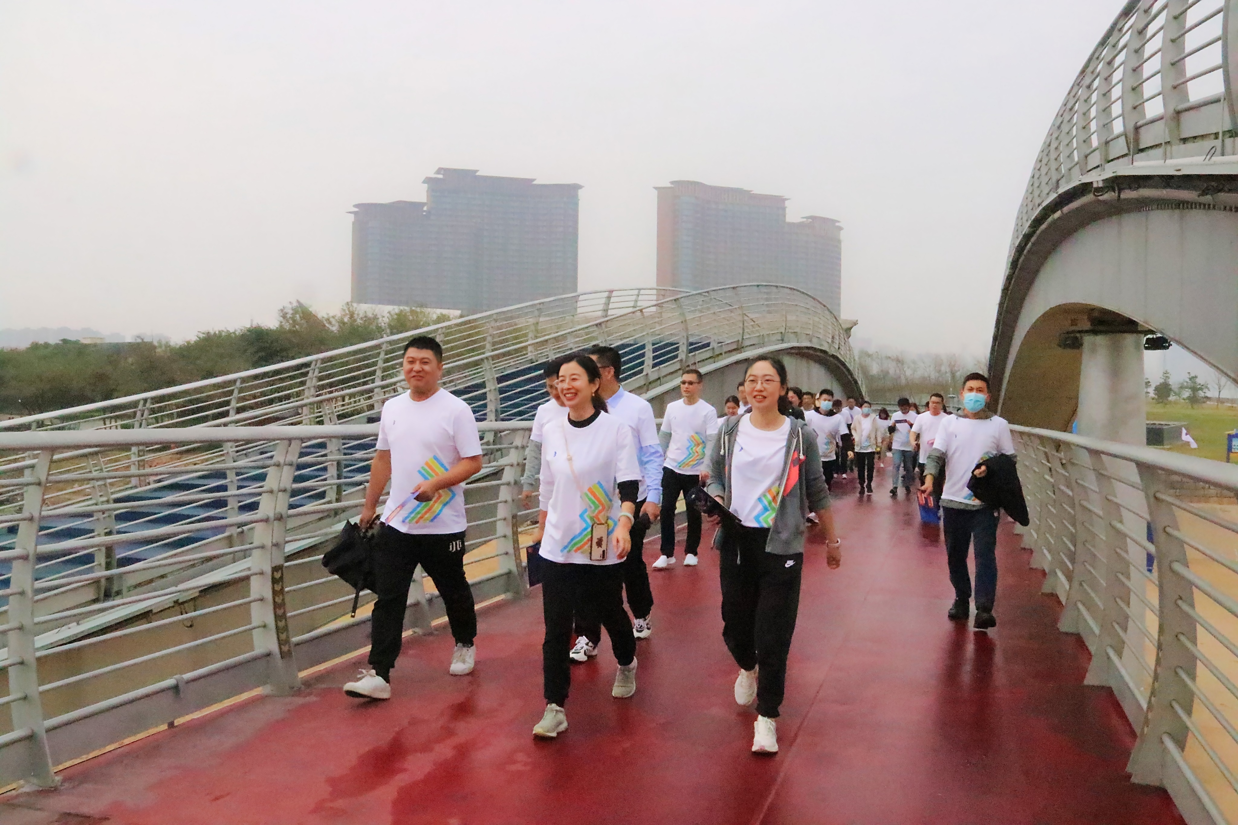 蒙蒙細雨,也擋不住大家的熱情。下午3時許,在集團黨委副書記王文景同志的宣布下,"活力海控 攜手同行"健步行活動正式開始,身著統(tǒng)一服裝的健步行隊伍從彩虹橋南岸出發(fā),浩浩蕩蕩,闊步前行。